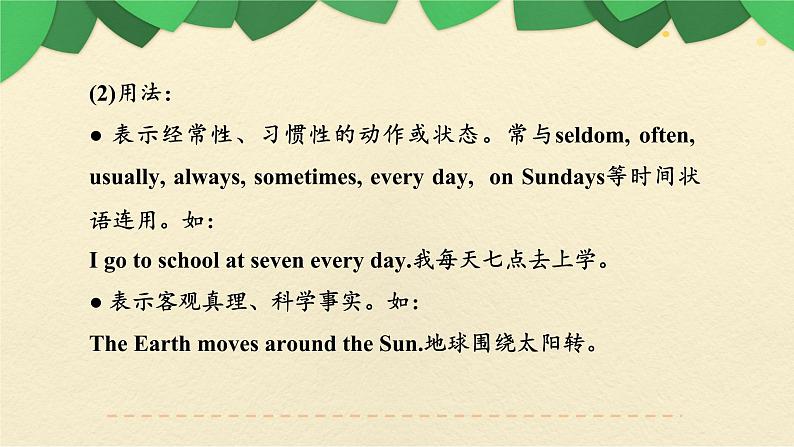 (2)用法:● 表示经常性、习惯性的动作或状态。常与seldm, ften, usually, always, smetimes, every day, n Sundays等时间状语连用。如:I g t schl at seven every day.我每天七点去上学。● 表示客观真理、科学事实。如:The Earth mves arund the Sun.地球围绕太阳转。