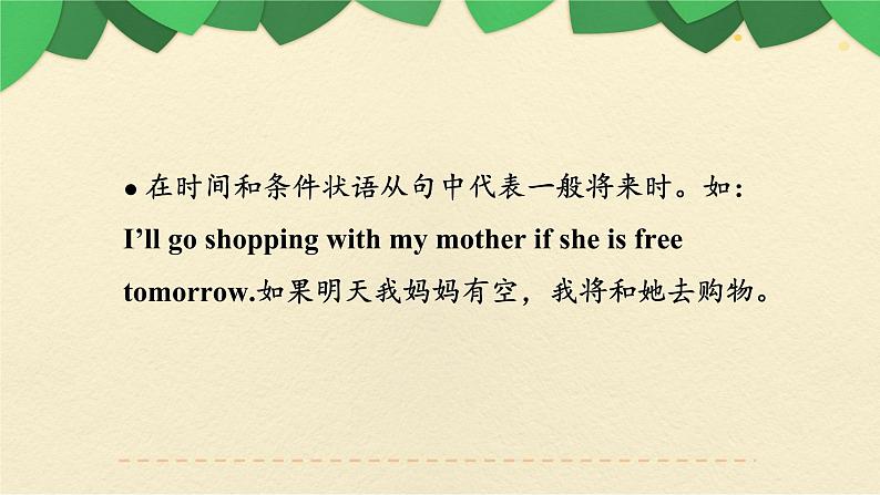 ● 在时间和条件状语从句中代表一般将来时。如:I’ll g shpping with my mther if she is free tmrrw.如果明天我妈妈有空,我将和她去购物。