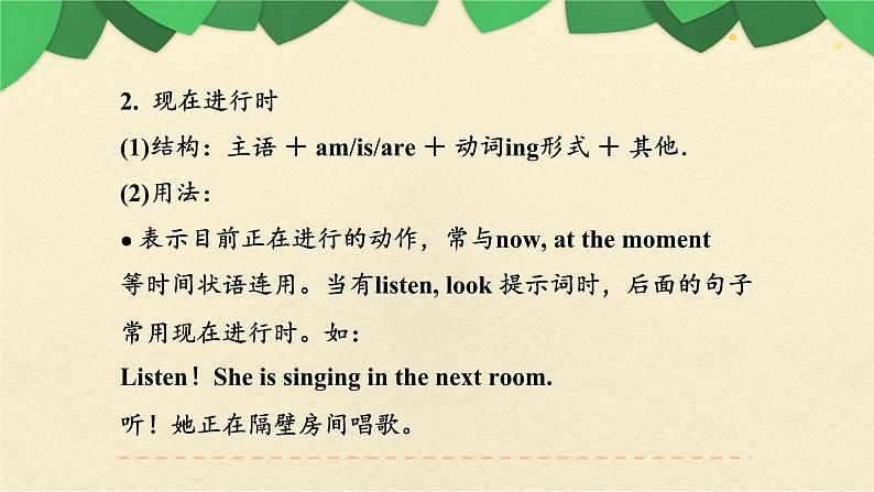 2. 现在进行时(1)结构:主语 + am/is/are + 动词ing形式 + 其他.(2)用法:● 表示目前正在进行的动作,常与nw, at the mment 等时间状语连用。当有listen, lk 提示词时,后面的句子常用现在进行时。如:Listen!She is singing in the next rm. 听!她正在隔壁房间唱歌。