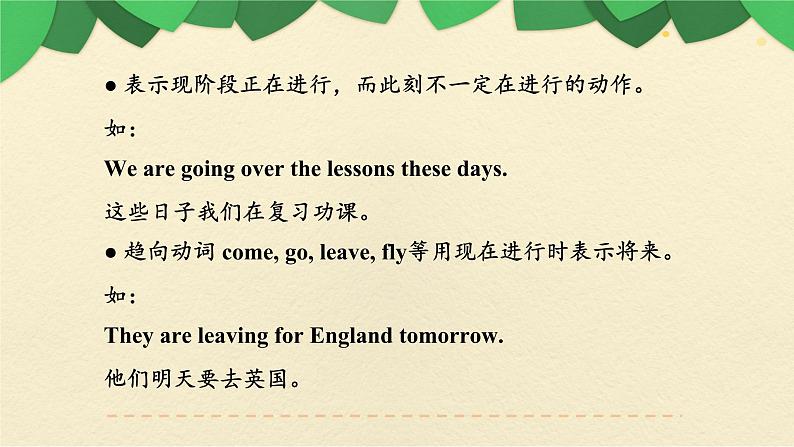 ● 表示现阶段正在进行,而此刻不一定在进行的动作。如:We are ging ver the lessns these days.这些日子我们在复习功课。● 趋向动词 cme, g, leave, fly等用现在进行时表示将来。如:They are leaving fr England tmrrw.他们明天要去英国。