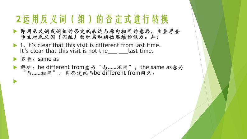 即用反义词或词组的否定式表达与原句相同的意思,主要考查学生对反义词(词组)的积累和换位思维的能力。如:1. It’s clear that this visit is different frm last time.