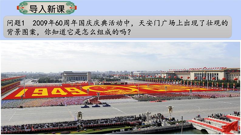 问题1 2009年60周年国庆庆典活动中,天安门广场上出现了壮观的背景图案,你知道它是怎么组成的吗?