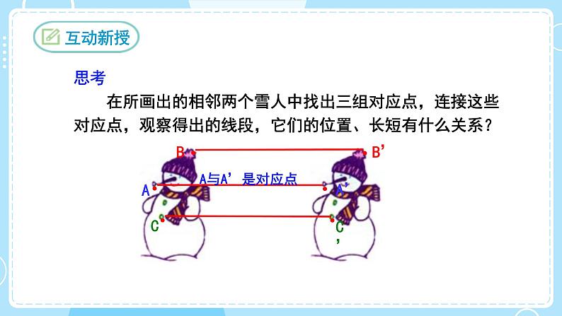 思考 在所画出的相邻两个雪人中找出三组对应点,连接这些对应点,观察得出的线段,它们的位置、长短有什么关系?
