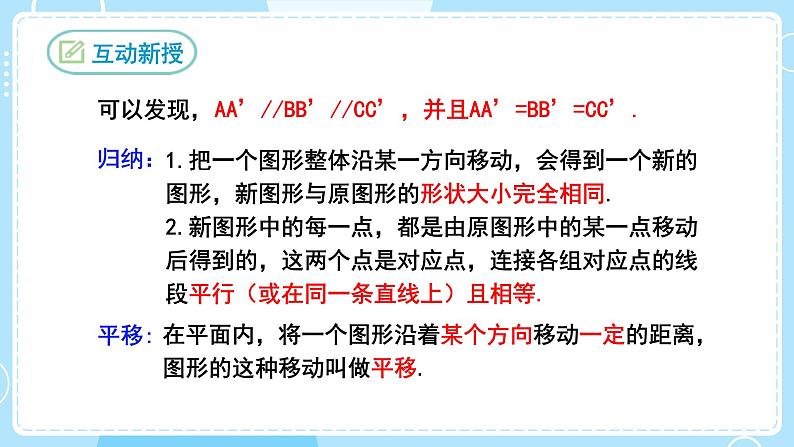 1.把一个图形整体沿某一方向移动,会得到一个新的图形,新图形与原图形的形状大小完全相同.2.新图形中的每一点,都是由原图形中的某一点移动后得到的,这两个点是对应点,连接各组对应点的线段平行(或在同一条直线上)且相等.