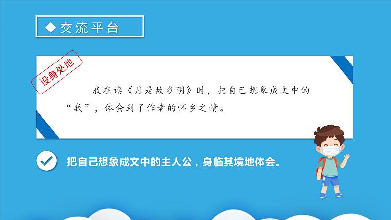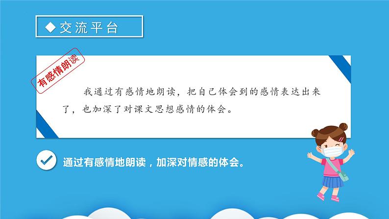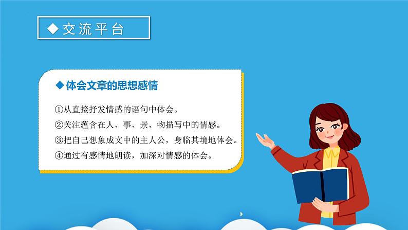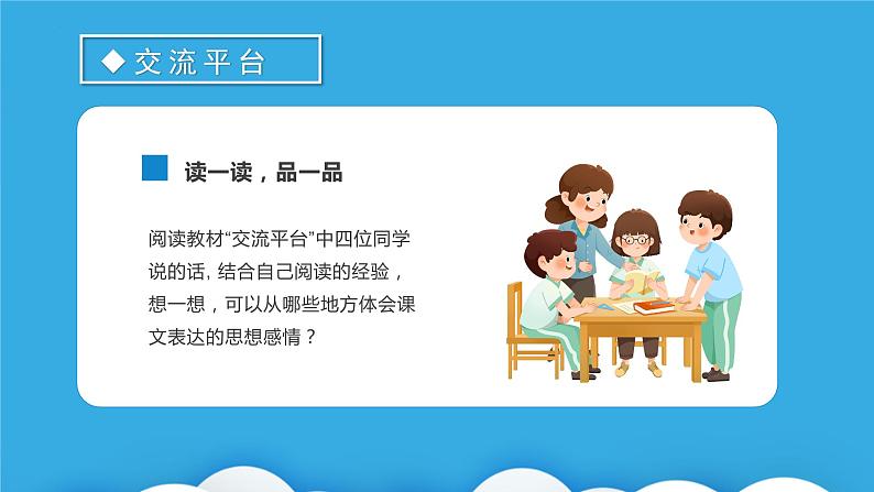 阅读教材“交流平台”中四位同学说的话, 结合自己阅读的经验,想一想,可以从哪些地方体会课文表达的思想感情?