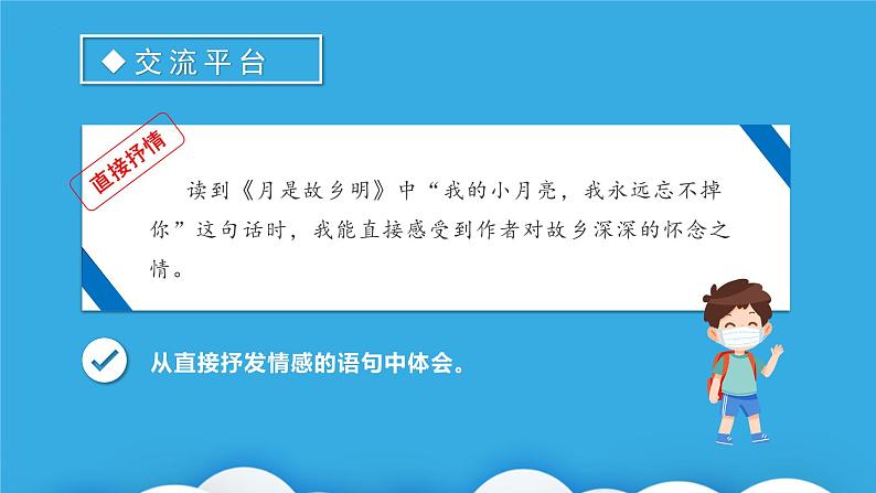 读到《月是故乡明》中“我的小月亮,我永远忘不掉你”这句话时,我能直接感受到作者对故乡深深的怀念之情。