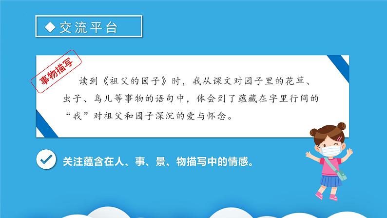 读到《祖父的园子》时,我从课文对园子里的花草、虫子、鸟儿等事物的语句中,体会到了蕴藏在字里行间的“我”对祖父和园子深沉的爱与怀念。