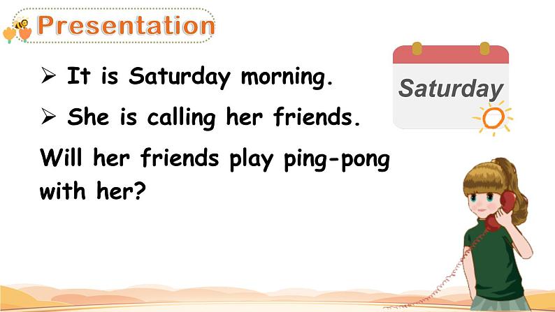 It is Saturday mrning. She is calling her friends.Will her friends play ping-png with her?
