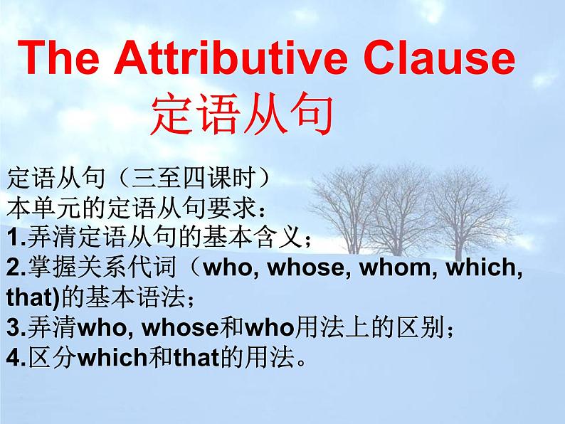 1.定语从句:修饰某一名词或代词的从句叫定语从句。定语从句一般紧跟在它所修饰的先行词之后。