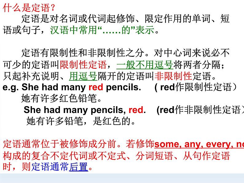 展开什么是定语? 定语是对名词或代词起修饰、限定作用的单词、短语或句子,汉语中常用“……的”表示。 定语有限制性和非限制性之分。对中心词来说必不可少的定语叫限制性定语,一般不用逗号将两者分隔;只起补充说明、用逗号隔开的定语叫非限制性定语。e.g. She had many red pencils. ( red作限制性定语) 她有许多红色铅笔。 She had many pencils, red. (red作非限制性定语) 她有许多铅笔,是红色的。定语通常位于被修饰成分前。若修饰sme, any, every, n构成的复合不定代词或不定式、分词短语、从句作定语时,则定语通常后置。