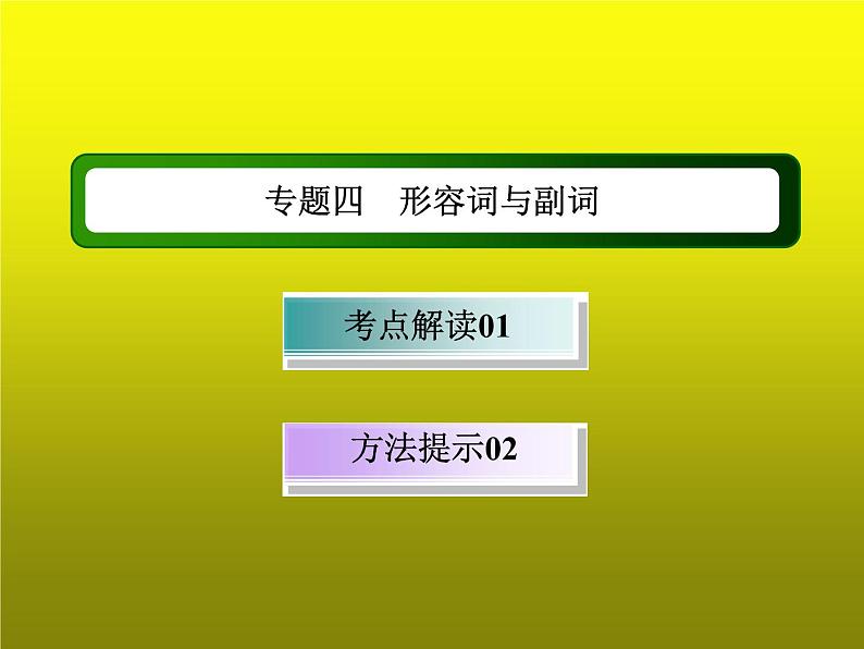 2023届高考英语二轮复习形容词和副词课件: 这是一份2023届高考英语二轮复习形容词和副词课件,共60页。PPT课件主要包含了考点精讲,2不规则变化,常见的形容词后缀,形容词转换为副词,难点释疑,解题策略,cleaner ,earlier ,harder ,易错聚焦等内容,欢迎下载使用。