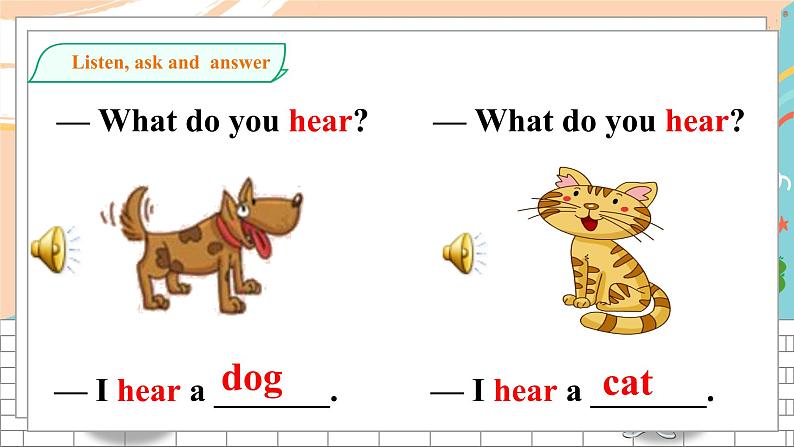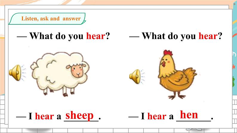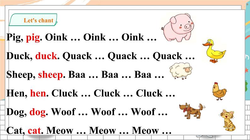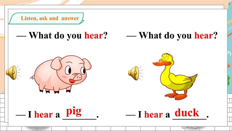 这是一份新版-牛津上海版一年级下册Unit 2 Listen and hear习题ppt课件,文件包含Unit2ListenandhearLetsact课件pptx、Unit2ListenandhearLetsact教案docx、Unit2ListenandhearLetsact习题docx、母鸡的叫声cluckwav、狗叫woofwav、猪叫wav、猫叫meowwav、绵羊叫声baawav、鸭叫wav、P9enjoyswf、actswf、新词汇WMV等12份课件配套教学资源,其中PPT共21页, 欢迎下载使用。