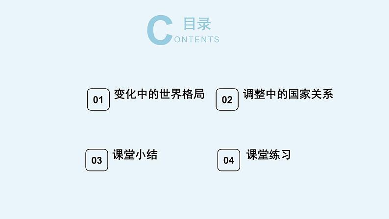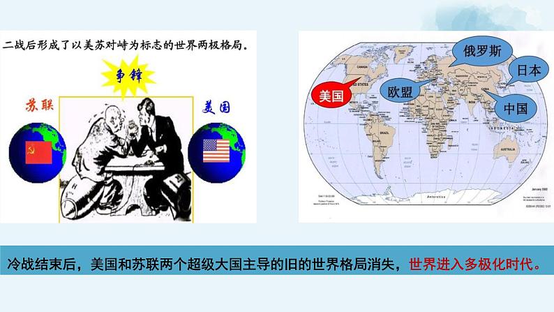 这是一份初中政治 (道德与法治)人教部编版九年级下册复杂多变的关系集体备课ppt课件,共45页。PPT课件主要包含了2复杂多变的关系,重点问题,变化中的世界格局,两极格局打破,调整中的国家交往,课堂总结,课堂练习等内容,欢迎下载使用。