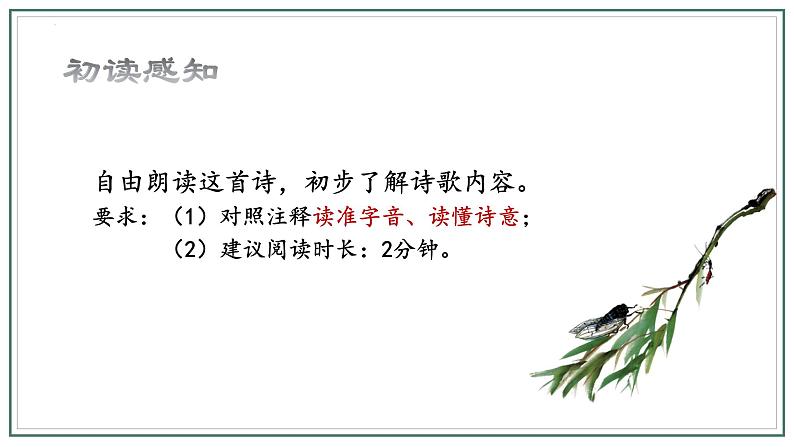 自由朗读这首诗,初步了解诗歌内容。要求:(1)对照注释读准字音、读懂诗意; (2)建议阅读时长:2分钟。