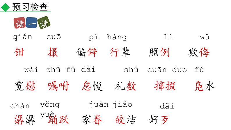 钳 撮 偏僻 行辈 照例 欺侮宽慰 嘱咐 怠慢 礼数 撺掇 凫水潺潺 踊跃 家眷 皎洁 好歹