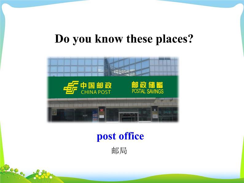 1、Learn sme new wrds abut places: pst ffice, plice, htel, restaurant, bank, hspital, street, pay phne, park, etc.2、通过语言活动感知there be句型的一般疑问句及其回答;3、能用英语询问和描述各种设施及它们的地理位置; 4、通过课堂活动提高听说能力。