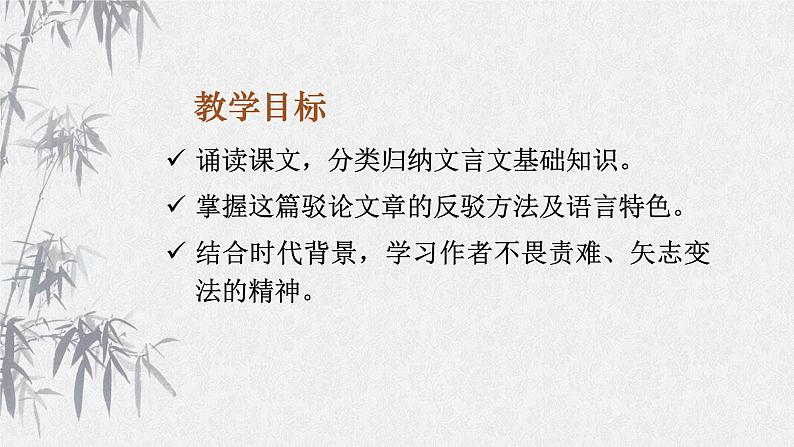 诵读课文,分类归纳文言文基础知识。掌握这篇驳论文章的反驳方法及语言特色。结合时代背景,学习作者不畏责难、矢志变法的精神。