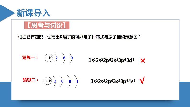 人教版 (2019)选择性必修2第一节 原子结构公开课ppt课件: 这是一份人教版 (2019)选择性必修2第一节 原子结构公开课ppt课件,共24页。PPT课件主要包含了情境导入,目标一构造原理,构造原理,能级交错,电子排布式,电子数,能级符号,s22s22p3,s22s22p4,4s1等内容,欢迎下载使用。