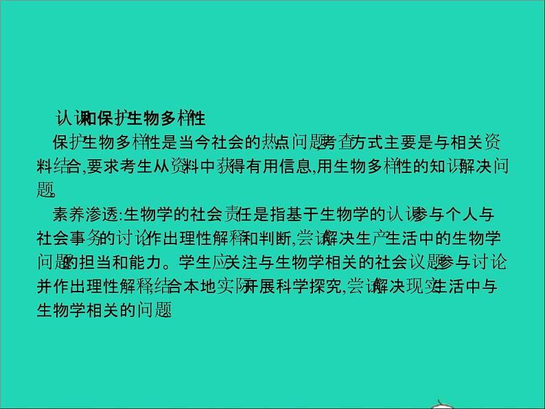展开认识和保护生物多样性保护生物多样性是当今社会的热点问题,考查方式主要是与相关资料结合,要求考生从资料中获得有用信息,用生物多样性的知识解决问题。素养渗透:生物学的社会责任是指基于生物学的认识参与个人与社会事务的讨论,作出理性解释和判断,尝试解决生产生活中的生物学问题的担当和能力。学生应关注与生物学相关的社会议题,参与讨论并作出理性解释;结合本地实际开展科学探究,尝试解决现实生活中与生物学相关的问题。