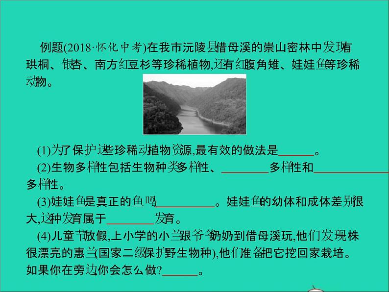 例题(2018·怀化中考)在我市沅陵县借母溪的崇山密林中发现有珙桐、银杏、南方红豆杉等珍稀植物,还有红腹角雉、娃娃鱼等珍稀动物。(1)为了保护这些珍稀动植物资源,最有效的做法是 。 (2)生物多样性包括生物种类多样性、 多样性和 多样性。 (3)娃娃鱼是真正的鱼吗? 。娃娃鱼的幼体和成体差别很大,这种发育属于 发育。 (4)儿童节放假,上小学的小兰跟爷爷奶奶到借母溪玩,他们发现一株很漂亮的惠兰(国家二级保护野生物种),他们准备把它挖回家栽培。如果你在旁边,你会怎么做? 。