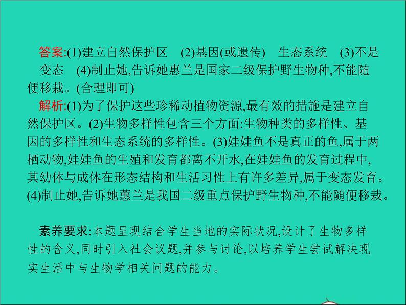答案:(1)建立自然保护区 (2)基因(或遗传) 生态系统 (3)不是 变态 (4)制止她,告诉她惠兰是国家二级保护野生物种,不能随便移栽。(合理即可) 解析:(1)为了保护这些珍稀动植物资源,最有效的措施是建立自然保护区。(2)生物多样性包含三个方面:生物种类的多样性、基因的多样性和生态系统的多样性。(3)娃娃鱼不是真正的鱼,属于两栖动物,娃娃鱼的生殖和发育都离不开水,在娃娃鱼的发育过程中,其幼体与成体在形态结构和生活习性上有许多差异,属于变态发育。(4)制止她,告诉她蕙兰是我国二级重点保护野生物种,不能随便移栽。 素养要求:本题呈现结合学生当地的实际状况,设计了生物多样性的含义,同时引入社会议题,并参与讨论,以培养学生尝试解决现实生活中与生物学相关问题的能力。