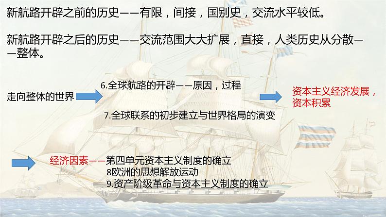 展开高中历史人教统编版(必修)中外历史纲要(下)第6课 全球航路的开辟 课前预习ppt课件: 这是一份高中历史人教统编版(必修)中外历史纲要(下)第6课 全球航路的开辟 课前预习ppt课件,共25页。PPT课件主要包含了豁然开朗新世界,你来我往大交换,冲击碰撞互影响,改天换地,孤立分散,联系整体,点线面,勾连世界,文明的思考,文明地交流等内容,欢迎下载使用。