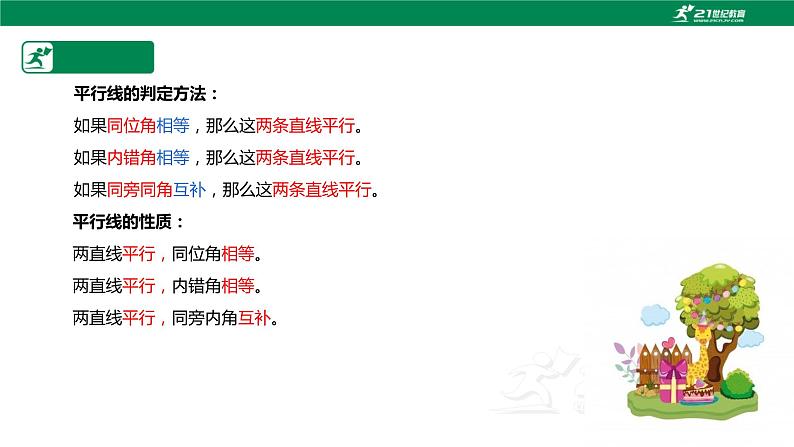 学习目标1)熟练应用平行线的性质与判定条件解决问题。2)通过证明过程,初步理解简单的几何推理。重点熟练应用平行线的性质与判定条件解决问题。难点通过证明过程,初步理解简单的几何推理。