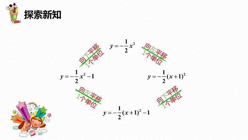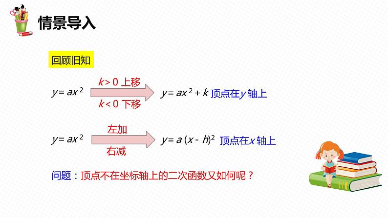 将抛物线在平面直角坐标系中平移,关键就是顶点坐标在发生变化,抛物线的形状和大小不变,故紧扣顶点式 y=a (x-h)2+k 中h,k 的变化即可.