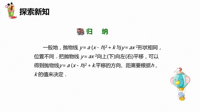一般地,抛物线 y=a (x-h)2+k 与y=ax 2形状相同,位置不同.把抛物线 y=ax 2向上(下)向左(右)平移,可以得到抛物线y=a (x-h)2+k.平移的方向、距离要根据h,k 的值来决定.