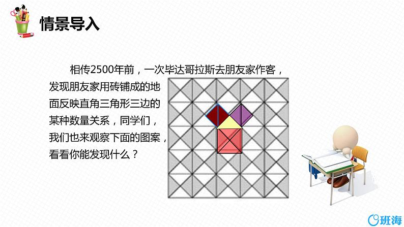 展开相传2500年前,一次毕达哥拉斯去朋友家作客,发现朋友家用砖铺成的地面反映直角三角形三边的某种数量关系,同学们,我们也来观察下面的图案,看看你能发现什么?
