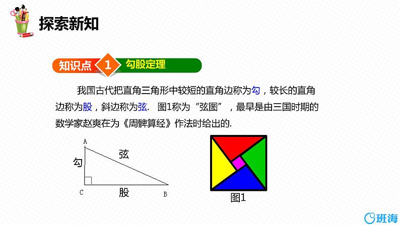 我国古代把直角三角形中较短的直角边称为勾,较长的直角边称为股,斜边称为弦. 图1称为“弦图”,最早是由三国时期的数学家赵爽在为《周髀算经》作法时给出的.