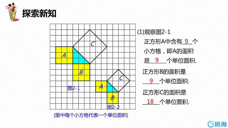 (2)在图2-2中,正方形A,B, C 中各含有多少个小方格? 它们的面积各是多少?
