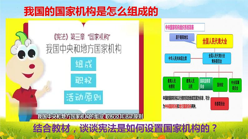 这是一份初中政治 (道德与法治)人教部编版八年级下册治国安邦的总章程一等奖课件ppt,共23页。PPT课件主要包含了设置国家机构,什么是国家机构,授予特定职权,规范权力运行,上述材料说明了什么等内容,欢迎下载使用。