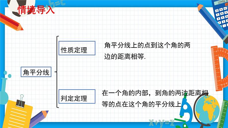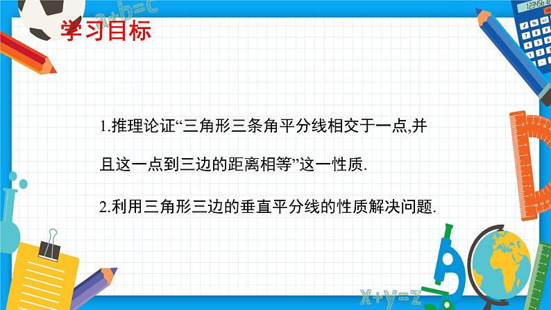 1.推理论证“三角形三条角平分线相交于一点,并且这一点到三边的距离相等”这一性质.
