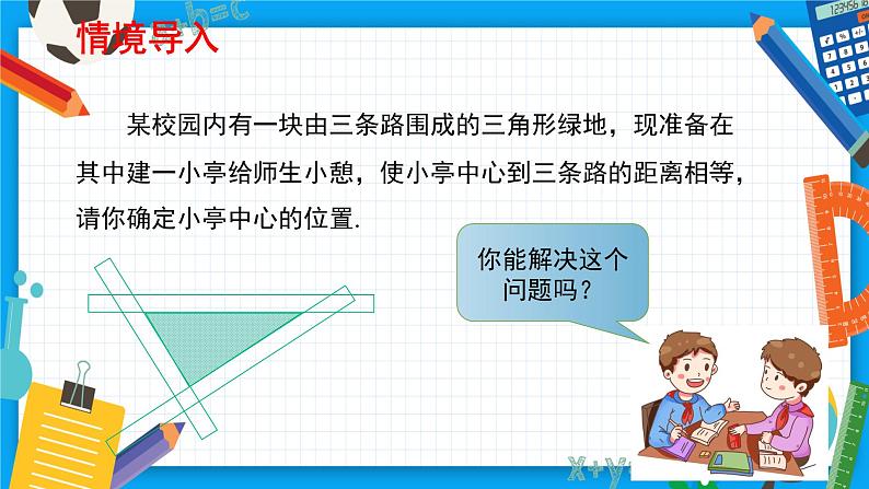 某校园内有一块由三条路围成的三角形绿地,现准备在其中建一小亭给师生小憩,使小亭中心到三条路的距离相等,请你确定小亭中心的位置.