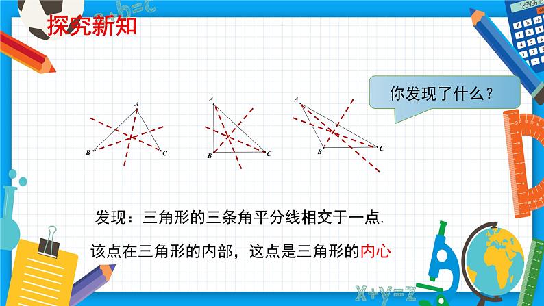 问题(1)观察三个三角形的形状?它们分别代表什么三角形?问题(2)观察三条角平分线,你发现了什么?问题(3)通过观察思考,你能得出什么结论?