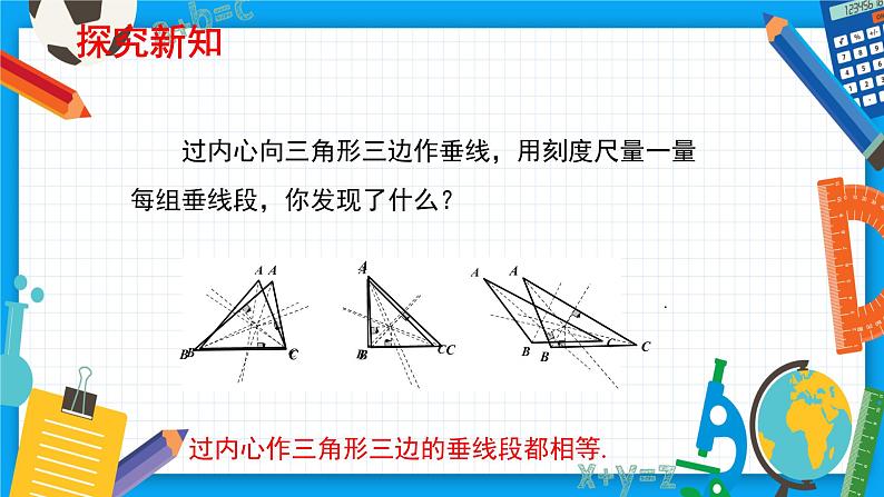 过内心向三角形三边作垂线,用刻度尺量一量每组垂线段,你发现了什么?