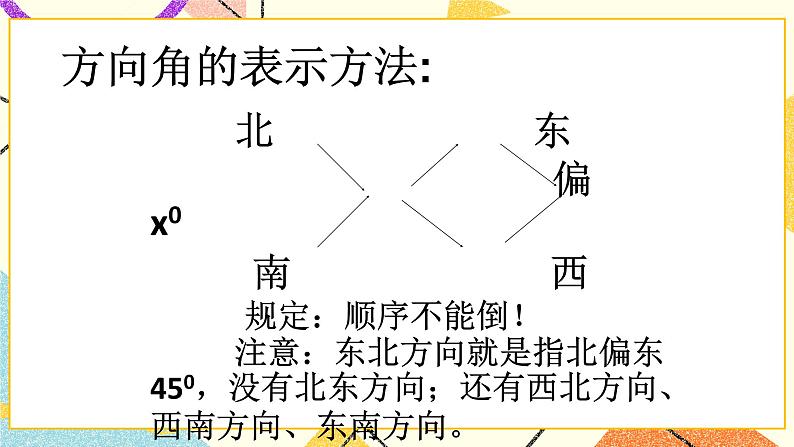 第七章 线段与角的画法复习整理60o150o45o135o(90-x)(180-x) ①30o角的余角是____、补角是_____;②45o角的余角是____、补角是_____;③如果∠α=xo,∠α的余角是______o、补角是______o.填空1、一个角与它的余角相等,这个角是怎样的角? 3、互补的两个角能否都是锐角?能否都是直角?能否都是钝角?为什么?2、一个角与它的补角相等,这个角是怎样的角?想一想1、如图,∠BAC=90°,∠DAE=90° 问:∠1和∠2有什么关系? 同角的余角相等 问:图中有哪几对互余的角?2、如图,点N、A、C在同一直线上,点M、A、D在同一直线上问:∠1和∠2有什么关系? 同角的补角相等 问:图中有哪几对互补的角?如图,已知点O是直线AB上的点,∠BOC=∠AOD=35°,则图中互补的角有______对.4方向角的表示方法: 北 东 偏 x0 南 西 规定:顺序不能倒! 注意:东北方向就是指北偏东450,没有北东方向;还有西北方向、西南方向、东南方向。5海里用1厘米表示如图,点B、C是线段AD上的两点,且AD=60cm,AC=35cm,BD=40cm,求BC的长。如图,线段AB被点M分成2﹕3两段,同时又被点N分成4﹕1两段,如果MN=5cm,求线段BN的长。线段AB=5,BC=4,那么A、C两点之间的距离是A.1 B.9 C.1,9 D.以上都不对。 什么叫两点之间的距离? 联结两点的线段的长度叫两点之间的距离。 线段的基本性质: 两点之间,线段最短。(在所有联结两点的线中,线段最短)如图,三角形ABC,比较大小:AB+AC____BC,理由是_______________. >两点之间,线段最短已知A,B,C三点在一条直线上,AB=5CM,BC=3CM,那么AC=多少厘米?