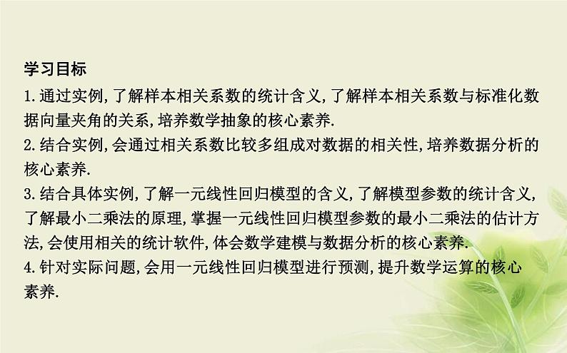 展开1.通过实例,了解样本相关系数的统计含义,了解样本相关系数与标准化数据向量夹角的关系,培养数学抽象的核心素养.2.结合实例,会通过相关系数比较多组成对数据的相关性,培养数据分析的核心素养.3.结合具体实例,了解一元线性回归模型的含义,了解模型参数的统计含义,了解最小二乘法的原理,掌握一元线性回归模型参数的最小二乘法的估计方法,会使用相关的统计软件,体会数学建模与数据分析的核心素养.4.针对实际问题,会用一元线性回归模型进行预测,提升数学运算的核心 素养.