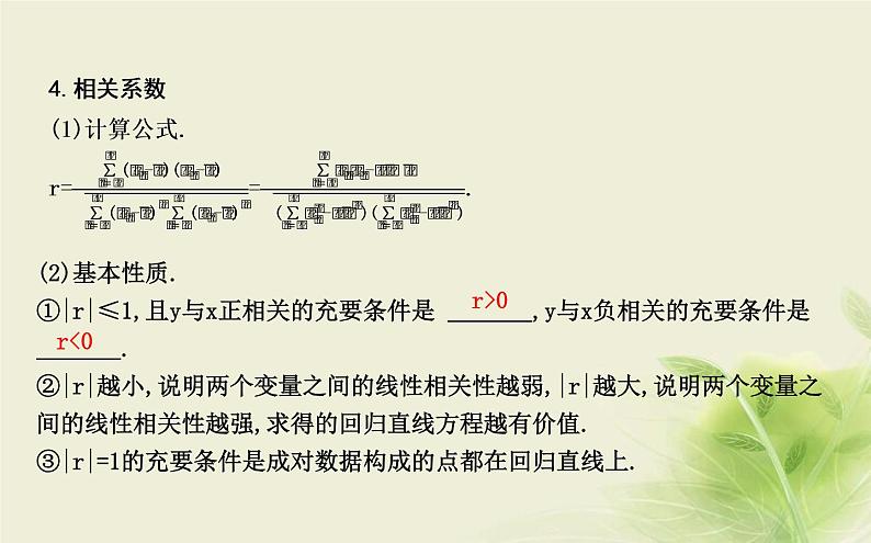 (2)基本性质.①|r|≤1,且y与x正相关的充要条件是 ,y与x负相关的充要条件是 .②|r|越小,说明两个变量之间的线性相关性越弱,|r|越大,说明两个变量之间的线性相关性越强,求得的回归直线方程越有价值.③|r|=1的充要条件是成对数据构成的点都在回归直线上.