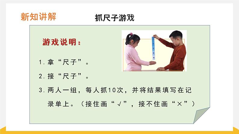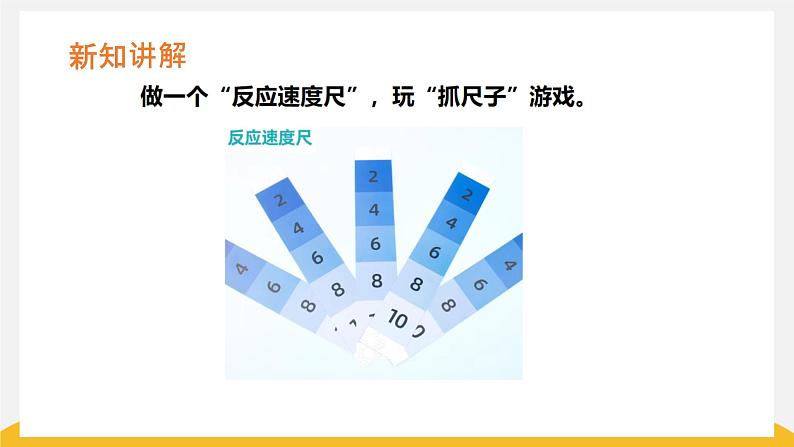 教科版 (2017)二年级下册4.测试反应快慢教课内容ppt课件: 这是一份教科版 (2017)二年级下册4.测试反应快慢教课内容ppt课件,共13页。PPT课件主要包含了测试反应快慢,游戏一翻拍手活动,注意事项等内容,欢迎下载使用。