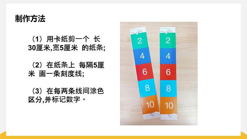 (1)用卡纸剪一个 长30厘米,宽5厘米 的纸条; (2)在纸条上 每隔5厘米 画一条刻度线; (3)在每两条线间涂色区分,并标记数字。