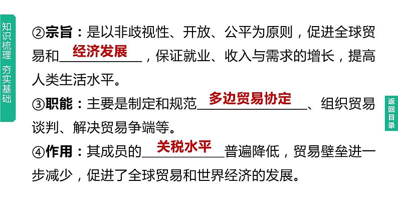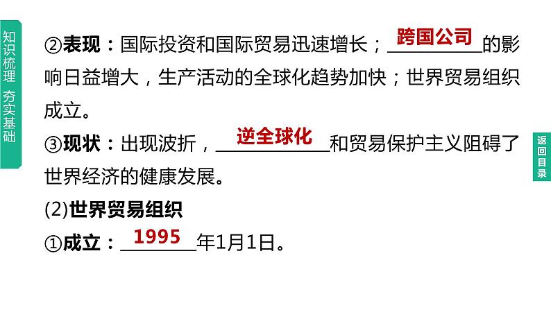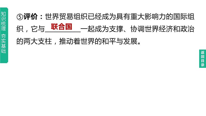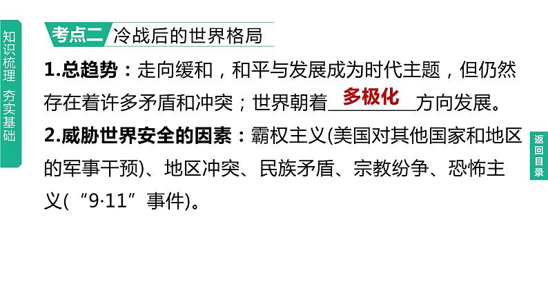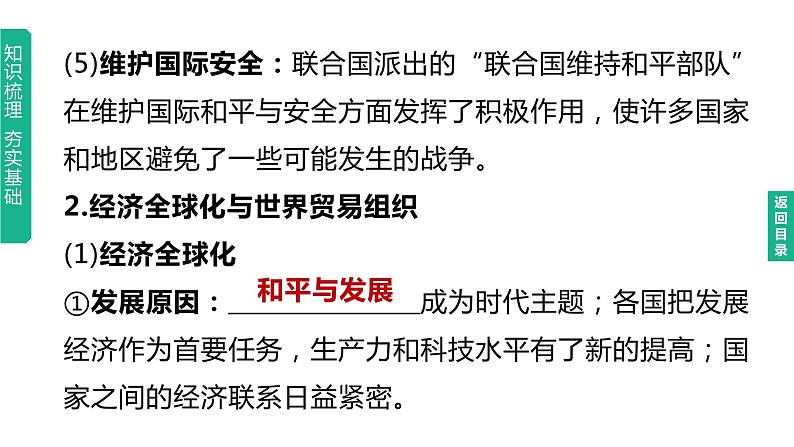 中考历史总复习一轮复习课件:主题32 走向和平发展的世界(含答案): 这是一份中考历史总复习一轮复习课件:主题32 走向和平发展的世界(含答案),共20页。PPT课件主要包含了联合国安全理事会,和平与发展,跨国公司,逆全球化,经济发展,多边贸易协定,关税水平,联合国,多极化,单极世界等内容,欢迎下载使用。