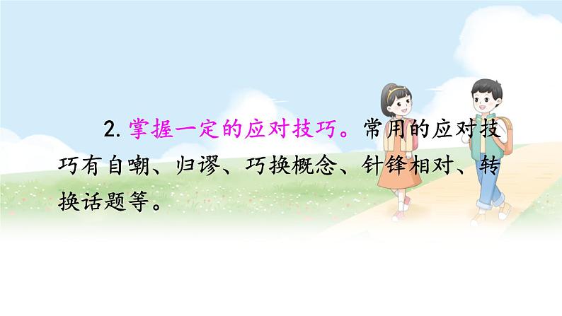 2.掌握一定的应对技巧。常用的应对技巧有自嘲、归谬、巧换概念、针锋相对、转换话题等。