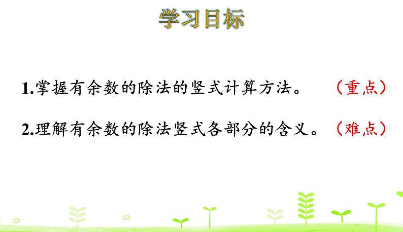 1.掌握有余数的除法的竖式计算方法。 (重点)2.理解有余数的除法竖式各部分的含义。(难点)