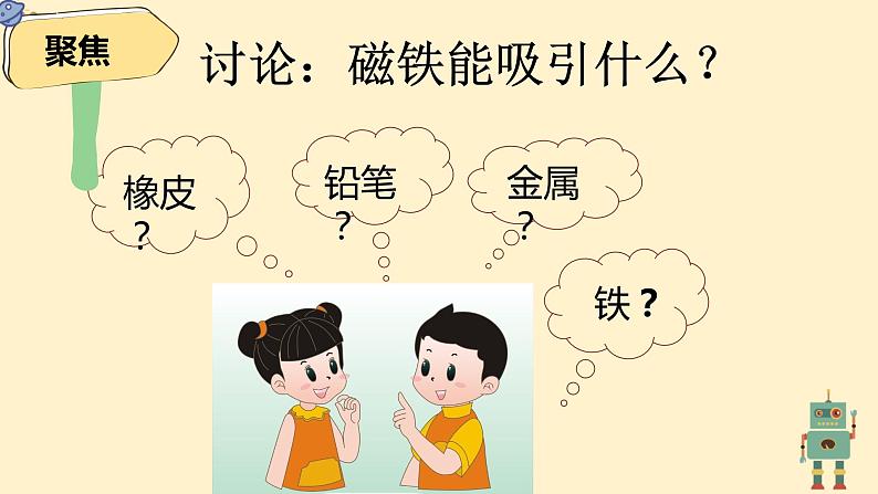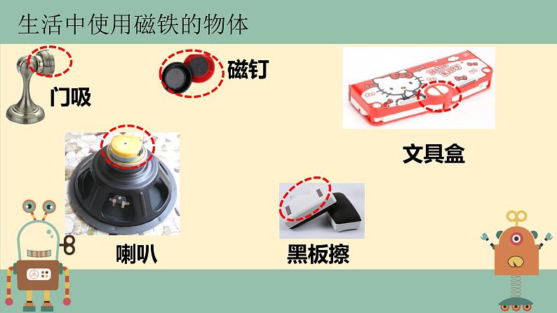 这是一份小学科学1.磁铁能吸引什么教学课件ppt,共14页。PPT课件主要包含了看一看,想一想,常见金属,做一做,磁铁能吸引什么,橡皮筋,写一写,铁一类的物体,试一试,小小检测员等内容,欢迎下载使用。