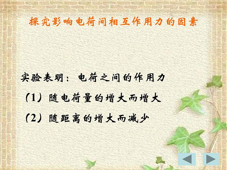 实验表明:电荷之间的作用力(1)随电荷量的增大而增大(2)随距离的增大而减少