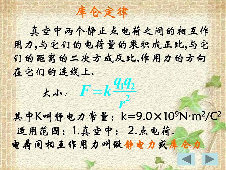 真空中两个静止点电荷之间的相互作用力,与它们的电荷量的乘积成正比,与它们的距离的二次方成反比,作用力的方向在它们的连线上.