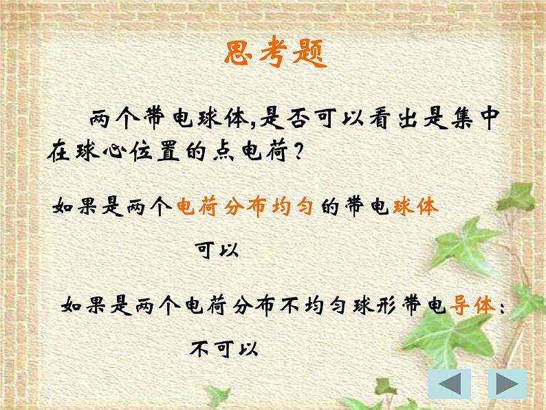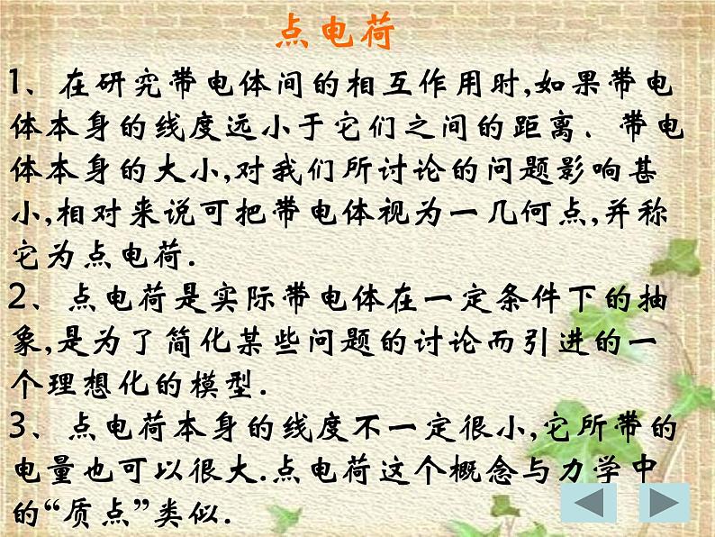 1、在研究带电体间的相互作用时,如果带电体本身的线度远小于它们之间的距离.带电体本身的大小,对我们所讨论的问题影响甚小,相对来说可把带电体视为一几何点,并称它为点电荷.2、点电荷是实际带电体在一定条件下的抽象,是为了简化某些问题的讨论而引进的一个理想化的模型.3、点电荷本身的线度不一定很小,它所带的电量也可以很大.点电荷这个概念与力学中的“质点”类似.