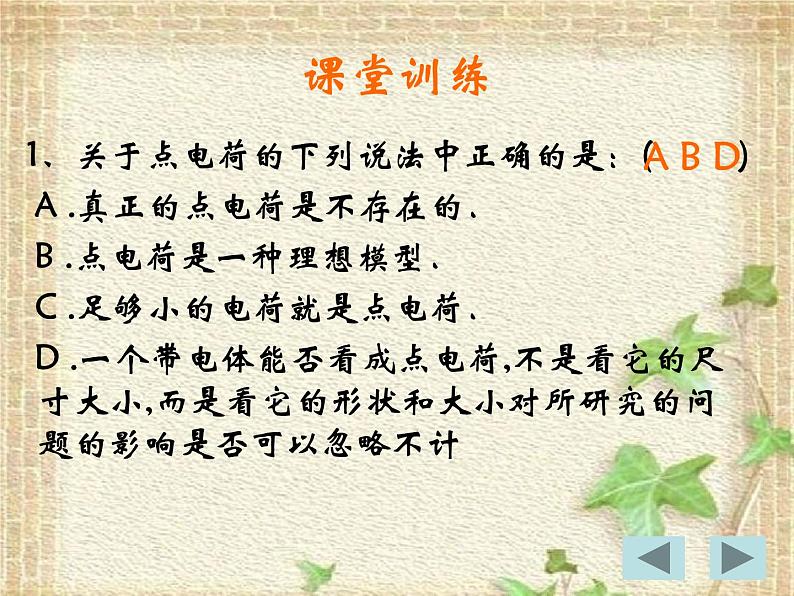 1、关于点电荷的下列说法中正确的是:( ) A .真正的点电荷是不存在的. B .点电荷是一种理想模型. C .足够小的电荷就是点电荷. D .一个带电体能否看成点电荷,不是看它的尺寸大小,而是看它的形状和大小对所研究的问题的影响是否可以忽略不计